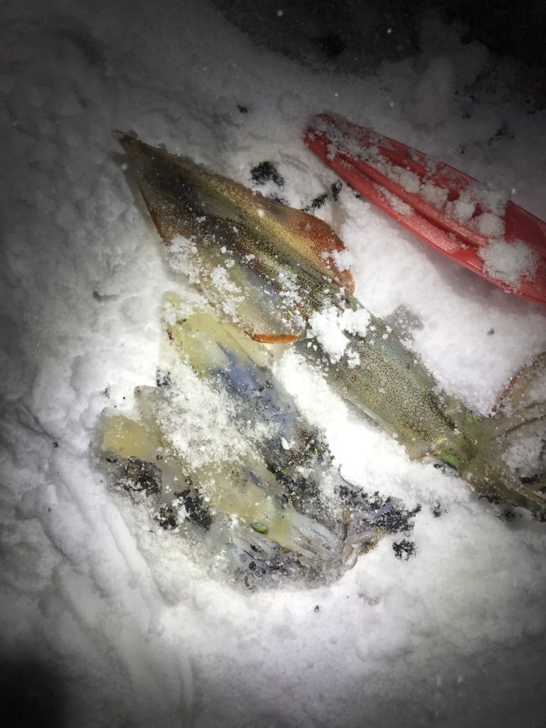 ヤリイカ寄ってる?ならば、とラッセルしながら老体に鞭打ちながら釣り場へ辿り着く。