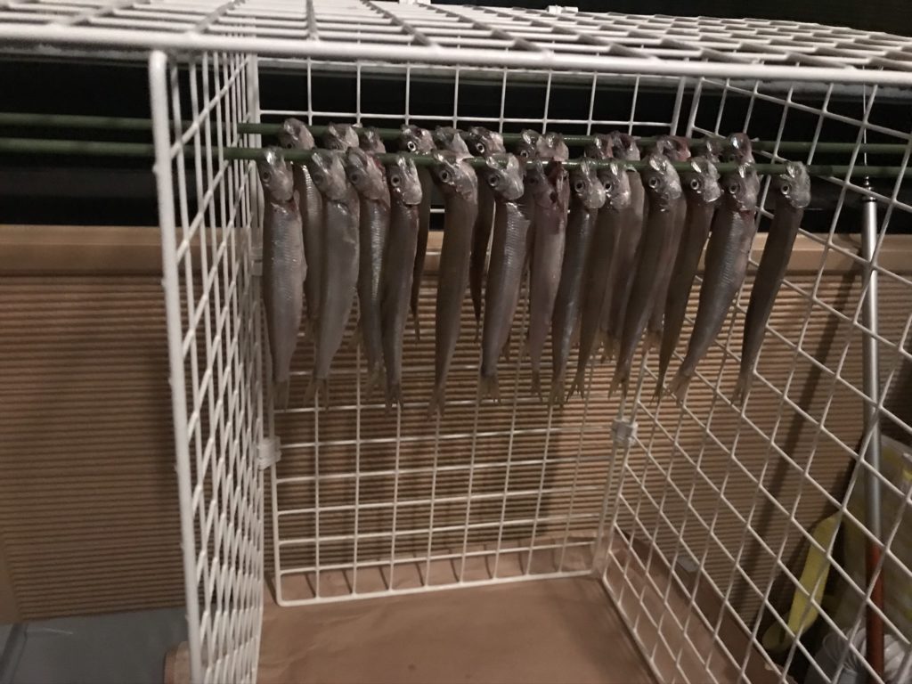 ※ダイソーのワイヤーネットと園芸資材を使い、玄関フードで干物づくり。