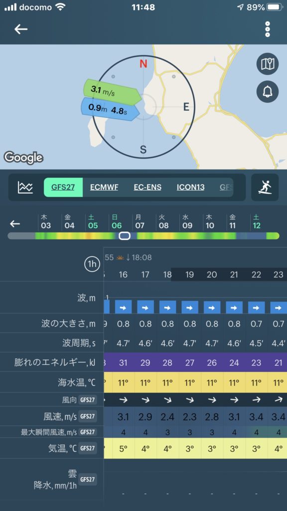 iphoneアプリのWindyで予報を見る限り、まともな釣りができる確率は、今のところ50%くらいでしょうか。