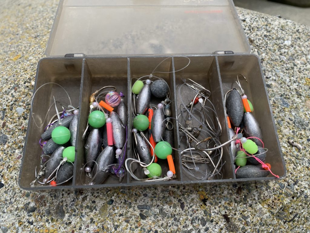 穴釣り用リグに、サンマを付けてヘチへ落とします。
